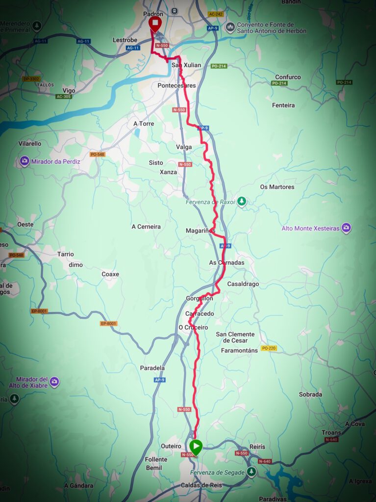 In Padrón, meiner heutigen Zielstadt, weht ein Hauch von Geschichte: Hier soll das Boot mit dem Leichnam des Apostels Jakobus nach seiner Hinrichtung in Jerusalem angelandet sein. Die kleine Kirche Iglesia de Santiago erinnert daran, ebenso der berühmte „Pedrón“, ein Stein, an dem das Boot festgemacht haben soll. Dieser Ort verbindet Mythos, Geschichte und Spiritualität auf einzigartige Weise.